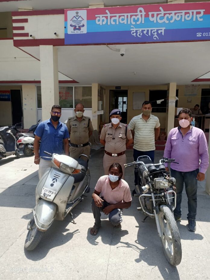 शुक्रवार को पुलिस ने चैकिंग के दौरान कमला पैलेस तिराहा पर आरोपी नाजिम उर्फ कालीझिरी को चोरी के मोटरसाईकिल यूपी 12 एएफ 2201 स्पैलडर प्रो वाहन के साथ गिरफ्तार किया गया। पूछताछ में आरोपी ने बताया कि एक अन्य वाहन एक्टिवा भी चोरी की गई है। जिसे आरोपी के घर से यूए 07 0489 बरामद की गयी। आरोपी के ऊपर पूर्व में भी 13 मुकदमे दर्ज हैं। आरोपी को पकड़ने वाली पुलिस टीम में उपनिरीक्षक कुन्दन राम थाना पटेलनगर, राजेन्द्र कुमार थाना पटेलनगर, कॉन्स्टेबल श्रीकान्त ध्यानी, आशीष कुमार, योगेश सिंह मौजूद थे।