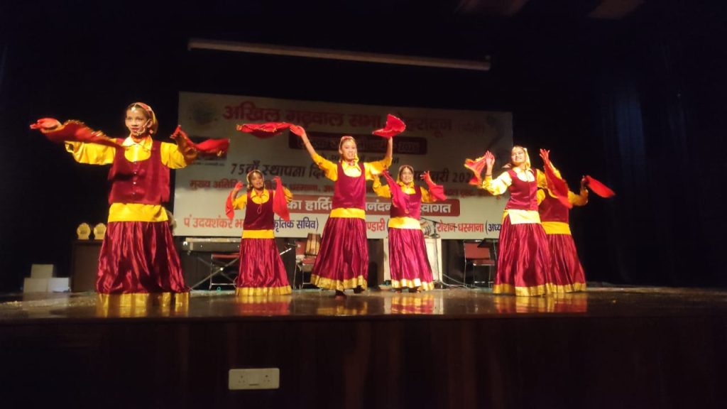 उत्तराखंड की सुप्रसिद्ध लोकगायिका संगीता ढौंडियाल ने अपने लोकप्रिय गीत तैं दिल्ली गुजरात और ढोल दमाऊ बजी गेना प्रस्तुत किया। इसके बाद अजबपुर की महिलाओं ने चौंफला लोकनृत्य प्रस्तुत किया। साथ ही तारेश्वरी भंडारी के नेतृत्व में मोहनपुर क्षेत्र की बहनों ने भी थड़िया नृत्य प्रस्तुत किया। पद्मश्री बसंती बिष्ट ने अपने शिष्यों के साथ झोड़ा नृत्य प्रस्तुत किया। आलोक मालासी ने गढ़वाली गीत प्रस्तुत किया, कवयित्री नीता कुकरेती ने सुन्दर गीत प्रस्तुत किया। कुलानंद घनशाला ने गढ़वाली कविता प्रस्तुत की। भगवान प्रसाद घिल्ड़ियाल ने पावन पवित्र धाम जै का बद्री केदार गीत प्रस्तुत किया। टाइनी स्कूल के विद्यार्थियों ने गढ़वाली लोकनृत्य प्रस्तुत किया और साथ ही बवस तवबा बीववस के विद्यार्थियों ने सुन्दर जागर पर नृत्य प्रस्तुत किया, जिसने दर्शकों को मंत्रमुग्ध कर दिया। निखिल सकलानी ने सुंदर गढ़वाली गीत प्रस्तुत किया। इससे पहले मुख्य अतिथि विजय धस्माना ने सभा की प्रशंसा करते हुए हीरक जयंती की बधाई देते हुए सभा को एसआरएचयू की तरफ से हरसम्भव सहयोग देने का आश्वासन दिया। इस अवसर पर अध्यक्ष रोहन धस्माना ने कहा कि यह सभा की हीरक जयंती वर्ष है और इस वर्ष अक्टूबर माह में 10 दिवसीय कौथिग के आयोजन के अतिरिक्त पूरे वर्ष विविध कार्यक्रम आयोजित किये जायेंगे। महासचिव गजेंद्र भंडारी ने कहा कि इस वर्ष नवादा भूमि पर भवन का विस्तार किया जाएगा। वीरेंद्र असवाल, सूर्य प्रकाश भट्ट, निर्मला बिष्ट, संतोष गैरोला, दिनेश बौड़ाई, संजय डिमरी, पंचम सिंह बिष्ट, पंडित दामोदर सेमवाल, दिवाकर भट्ट आदि उपस्थित रहे।