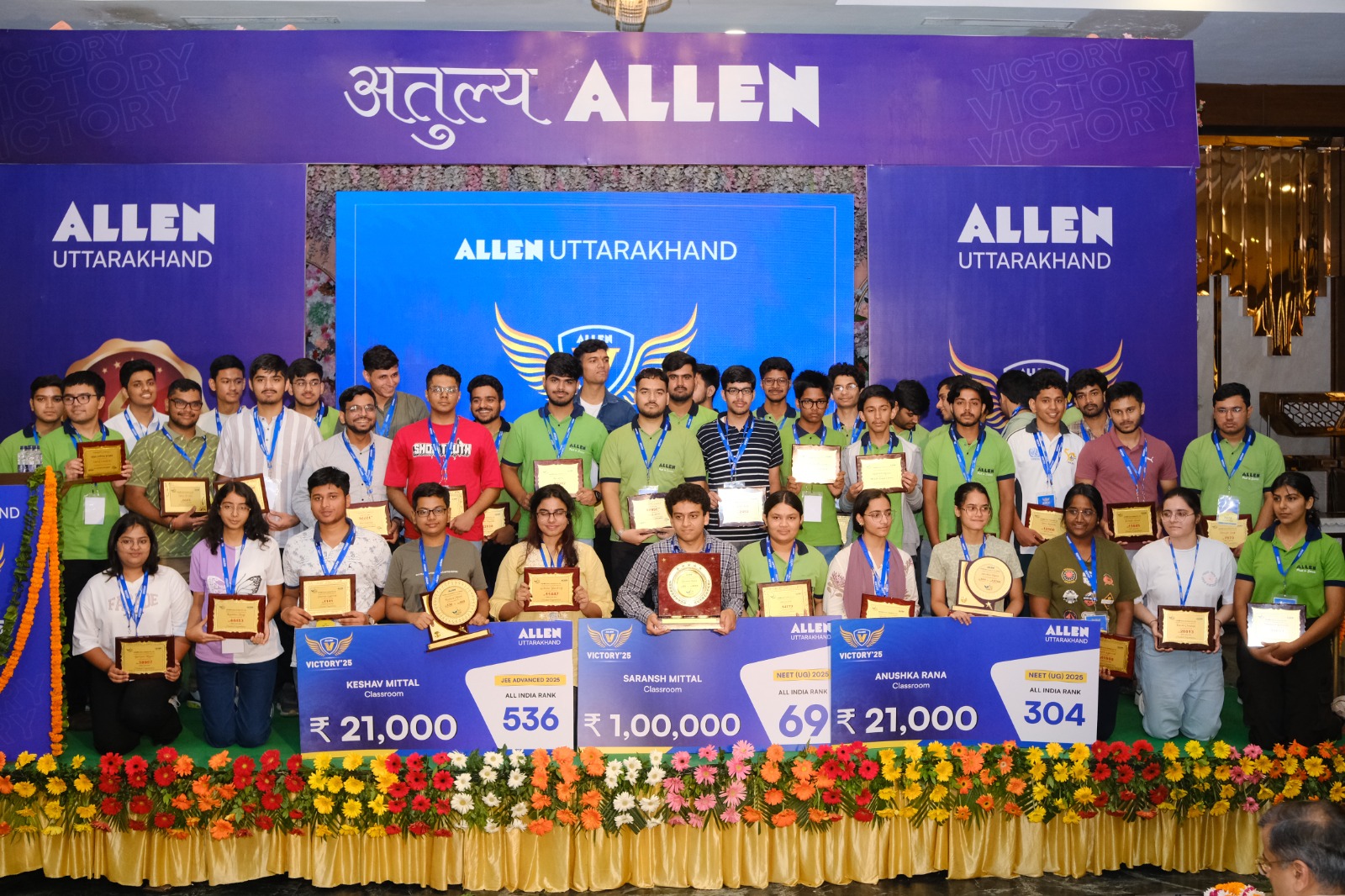 देहरादून, गढ़ संवेदना न्यूज । रविवार को जीएमएस रोड स्थित होटल सन पार्क इन में आयोजित एक भव्य समारोह में एलेन करियर इंस्टीट्यूट द्वारा हाल ही में आयोजित जेई एडवांस्ड परीक्षा में शानदार प्रदर्शन करने वाले छात्रों के सम्मान में विजय उत्सव मनाया गया। इस मौके पर नीट-यूजी में ऑल इंडिया रैंक-69 प्राप्त करने वाले सारांश मित्तल को एक लाख रुपए की राशि प्रदान की गई।