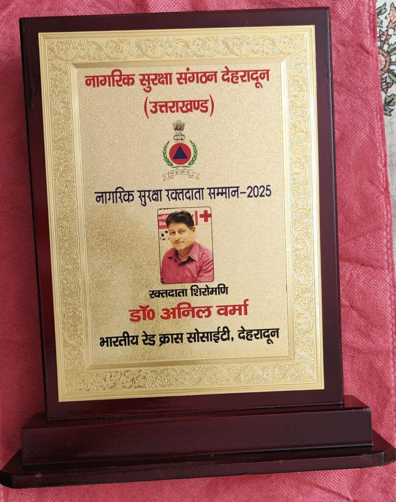 इसके अतिरिक्त डॉ० अनिल वर्मा को गुरुकुल कांगड़ी विश्वविद्यालय , हरिद्वार , कन्या गुरुकुल परिसर की ओर से वि०वि० समन्वयक प्रोफेसर (डॉ०) हेमन पाठक तथा प्रोफेसर (डॉ०) अर्चना डिमरी ने आपदा प्रबंधन आदि का प्रशिक्षण दक्षतापूर्वक प्रदान करने हेतु “गु० कां० विश्वविद्यालय, हरिद्वार सर्टिफिकेट ऑफ एक्सीलेंस“ के साथ ही शॉल ओढ़ाकर व तुलसी का पौधा भेंटकर सम्मानित किया।