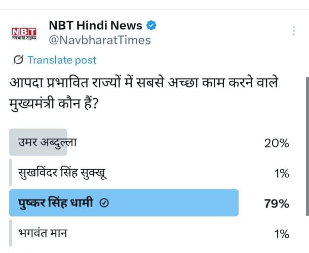 देहरादून। देश के आपदा प्रभावित राज्यों के मुख्यमंत्रियों के कामकाज पर आयोजित टाइम्स ग्रुप के सर्वे में उत्तराखंड के मुख्यमंत्री पुष्कर सिंह धामी ने शीर्ष स्थान हासिल किया है। देश के आपदा प्रभावित राज्यों के मुख्यमंत्रियों के प्रदर्शन को लेकर नवभारत टाइम्स ने हाल ही में एक ऑनलाइन सर्वे कराया। सवाल था “आपदा प्रभावित राज्यों में सबसे बेहतर काम करने वाले मुख्यमंत्री कौन हैं?” इस सर्वे में चार नाम शामिल थे उमर अब्दुल्ला, सुखविंदर सिंह सुक्खू, पुष्कर सिंह धामी और भगवंत मान।