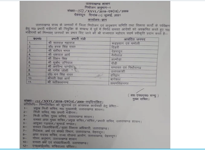 देहरादून। मुख्यमंत्री पुष्कर सिंह धामी ने सभी मंत्रियों को जिलों के प्रभार बांट दिए हैं। मुख्य सचिव एसएस संधु की ओर से इसके आदेश जारी कर दिए गए हैं।