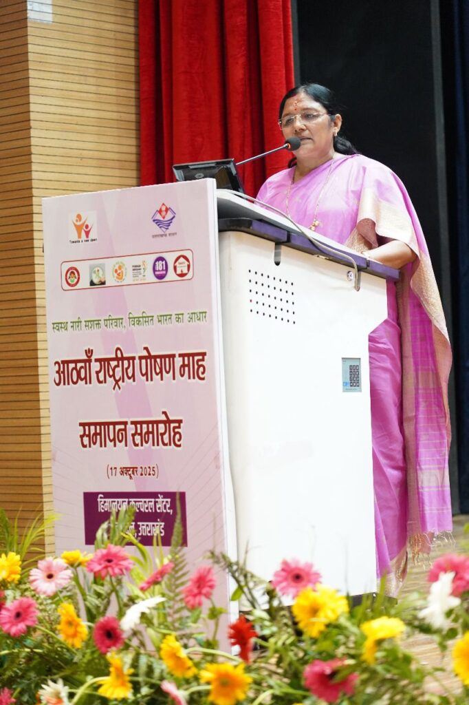 देहरादून। आठवें राष्ट्रीय पोषण माह 2025 का समापन समारोह शुक्रवार को हिमालयन कल्चरल सेण्टर, देहरादून में आयोजित किया गया। इस अवसर पर भारत सरकार की महिला एवं बाल विकास राज्य मंत्री सावित्री ठाकुर मुख्य अतिथि के रूप में उपस्थित रहीं। यह आयोजन पोषण जागरूकता, सामुदायिक सहभागिता और व्यवहार परिवर्तन को समर्पित एक माह लंबे जन आंदोलन के समापन का प्रतीक रहा। समारोह में उत्तराखंड की महिला सशक्तिकरण एवं बाल विकास मंत्री रेखा आर्या, उत्तराखंड के कृषि एवं ग्राम्य विकास मंत्री गणेश जोशी, भारत सरकार के महिला एवं बाल विकास मंत्रालय के अतिरिक्त सचिव लव अग्रवाल, उत्तराखंड महिला सशक्तिकरण एवं बाल विकास विभाग के सचिव चंद्रेश कुमार यादव तथा महिला एवं बाल विकास मंत्रालय भारत सरकार की संयुक्त सचिव राधिका झा भी उपस्थित रहीं।