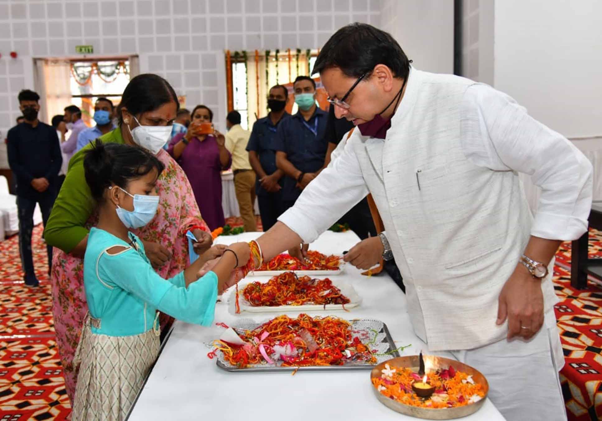 देहरादून। मुख्यमंत्री पुष्कर सिंह धामी ने मुख्यमंत्री आवास में रक्षाबंधन के अवसर पर नारी निकेतन से आई बालिकाओं और अन्य माताओं, बहनों से राखी बंधवाई। उत्तर प्रदेश के पूर्व मुख्यमंत्री कल्याण सिंह के निधन पर उत्तराखण्ड में एक दिन का राजकीय शोक होने से सीएम आवास में रक्षा बंधन पर आयोजित कार्यक्रम को निरस्त कर दिया गया। परन्तु जो बहनें जानकारी न होने के कारण सीएम आवास पहुंच गई थीं, उनसे मुख्यमंत्री ने राखी बंधवाई।