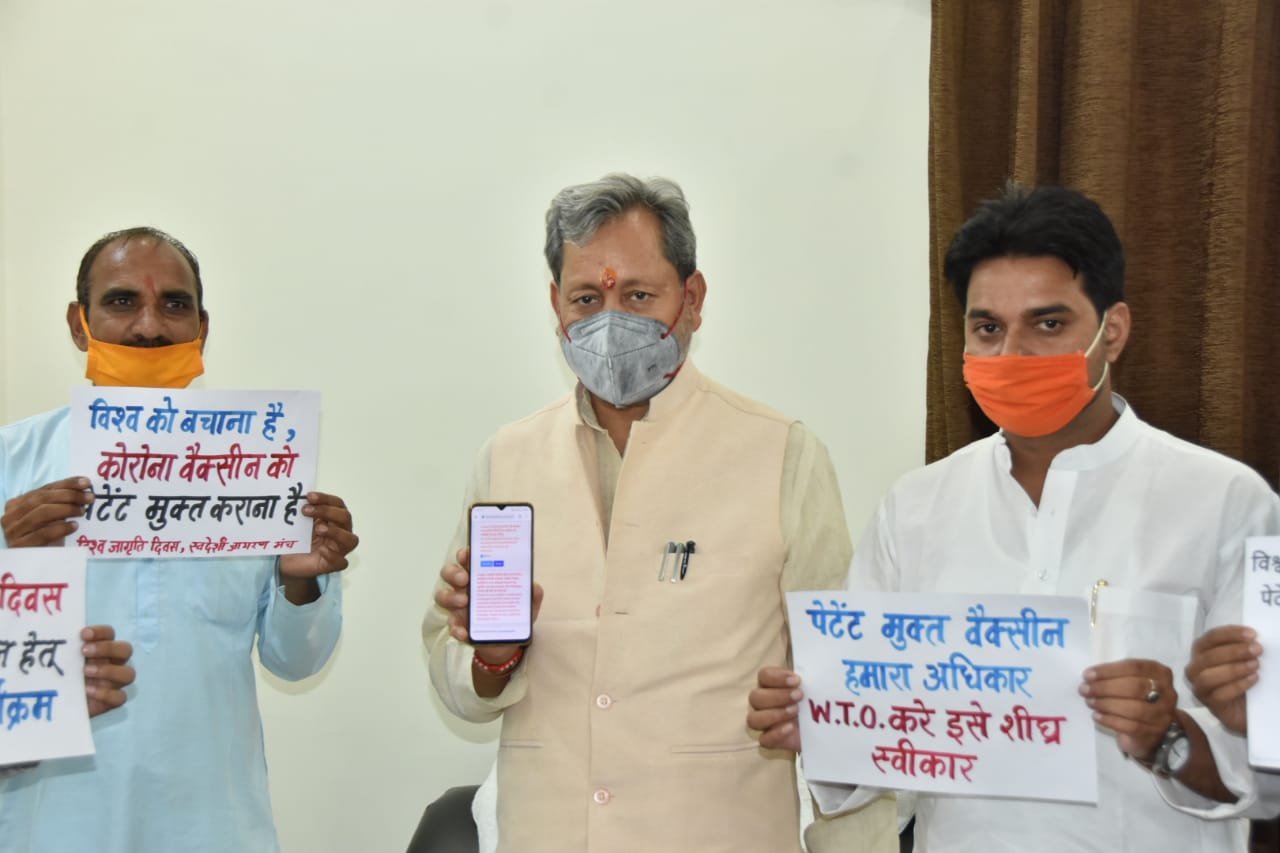 देहरादून। मुख्यमंत्री तीरथ सिंह रावत ने स्वदेशी जागरण मंच द्वारा कोरोना की वैक्सीन को पेटेंट मुक्त कराने के लिए चलाए जा रहे वैश्विक सर्व सुलभ टीकाकरण एवं चिकित्सा अभियान के अंतर्गत 20 जून को विश्व जागृति दिवस के दिन पेटेन्ट फ्री करने के लिए डिजिटल हस्ताक्षर कर समर्थन दिया। आज स्वदेशी जागरण मंच के प्रतिनिधि मंडल ने प्रांत के संयोजक सुरेंद्र सिंह के नेतृत्व में उत्तराखंड के मुख्यमंत्री तीरथ सिंह रावत से भेंट की तथा अभियान की जानकारी उन्हें दी जिसका समर्थन करते हुए मुख्यमंत्री तीरथ सिंह रावत ने कहा कि हमारा देश वसुदेव कुटुंबकम की बात को लेकर चलने वाला देश है, स्वदेशी जागरण मंच द्वारा चलाए जा रहे इस अभियान से कोरोना वैक्सीन पेटेंट मुक्त हो जाएगी तो वैक्सीन के उत्पादन में कोई कमी नहीं आएगी और जल्द से जल्द यह जनसामान्य तक पहुंच सकेगी। उन्होंने स्वयं इस अभियान में डिजिटल हस्ताक्षर कर अपना समर्थन दिया। स्वदेशी जागरण मंच प्रतिनिधिमंडल में प्रदेश के संयोजक सुरेंद्र सिंह प्रिंस यादव, आधार वर्मा, प्रिंस भट्ट, दीपक गैरोला, उपस्थित रहे। मुख्यमंत्री ने स्वदेशी जागरण मंच को शुभकामनाएं देते हुए कहा कि आपका यह अभियान सफल हो।