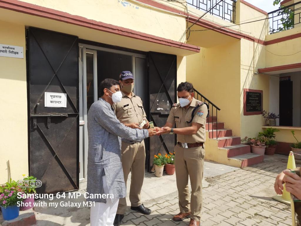 देहरादून। जोगेंदर पुंडीर फाउंडेशन और स्वदेशी तत्व द्वारा अशोक कुमार, डीजीपी, उत्तराखण्ड पुलिस को देहरादून पुलिस के अधिकारियो और जवानो को कोविड-19 महामारी की खिलाफ इम्युनिटी बढ़ाने के लिए निःशुल्क थ्रोटेक्स स्प्रे बाटे गये। जोगेंदर पुंडीर उपाध्यक्ष राज्य किसान मोर्चा तथा उपेन्दर अंथवाल, निदेशक, स्वदेशी तत्व ऑर्गैनिकस, देहरादून द्वारा आज उत्तराखण्ड डीजीपी, उत्तराखण्ड पुलिस कार्यालय में अशोक कुमार डीजीपी से मुलाकात कर उन्हें पुष्प गुच्छ भेंट किया।