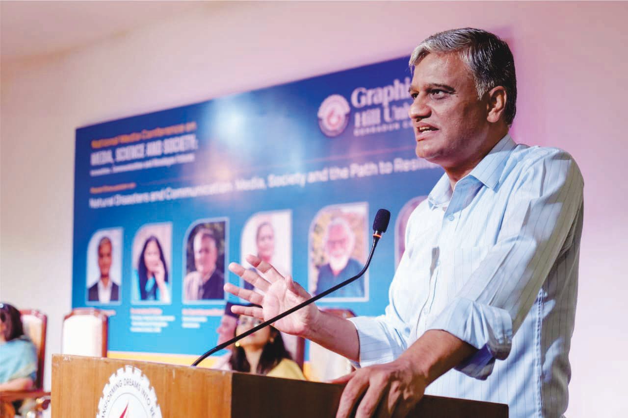 देहरादून। ग्राफिक एरा में प्राकृतिक आपदाओं में प्रभावी संचार और सामुदायिक सहयोग की निर्णायक भूमिका पर गहन मंथन हुआ। विशेषज्ञों ने न केवल मीडिया की जिम्मेदार भूमिका को उजागर किया, बल्कि हिमालयी क्षेत्रों में आपदा प्रबंधन के लिए नवीन दृष्टिकोण और व्यावहारिक सुझाव भी साझा किए, जो भविष्य की रणनीतियों के लिए मार्गदर्शक साबित होंगे। ग्राफिक एरा हिल यूनिवर्सिटी में मीडिया, विज्ञान और समाज के विषय पर राष्ट्रीय सम्मेलन का आयोजन किया गया। सम्मेलन को संबोधित करते हुए ग्राफिक एरा हिल यूनिवर्सिटी के कुलपति डा. अमित आर. भट्ट ने कहा यह सम्मेलन केवल अकादमिक उपलब्धियों का जश्न नहीं है, बल्कि मीडिया को सतत् विकास और समाज के निर्माण के लिए एक प्रभावशाली माध्यम के रूप में देखने का अवसर है। उन्होंने मीडिया इकोसिस्टम की अनुशासनात्मक प्रकृति पर जोर दिया और कहा कि यह सिर्फ एक सम्मेलन नहीं, बल्कि सतत् भविष्य के लिए एक आंदोलन होना चाहिए।