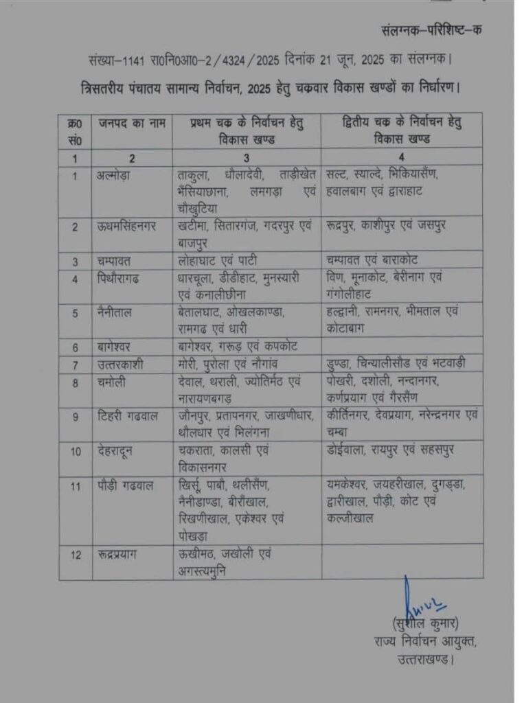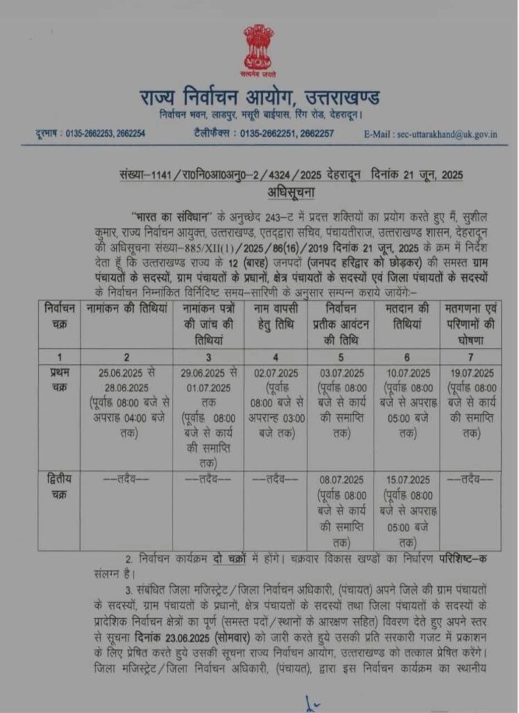 देहरादून। उत्तराखंड में हरिद्वार जिला छोड़ प्रदेश के अन्य 12 जिलों में त्रिस्तरीय पंचायत चुनाव कराए जाने संबंधित अधिसूचना जारी हो चुकी है। उत्तराखंड शासन की ओर से चुनावी कार्यक्रम की अधिसूचना जारी होने के बाद राज्य निर्वाचन आयोग ने शनिवार को प्रेसवार्ता को संबोधित किया। राज्य निर्वाचन आयुक्त सुशील कुमार ने बताया कि राज्य सरकार की ओर से आरक्षण की प्रक्रिया पूरी कर ली गई थी। साथ ही राज्य निर्वाचन आयोग को भी भेज दिया था। ऐसे में पंचायती राज सचिव की ओर से चुनावी अधिसूचना 21 जून को जारी होने के बाद अब जिला निर्वाचन अधिकारी 23 जून को चुनाव की सूचना जारी करेंगे। जारी अधिसूचना के अनुसार, प्रदेश में दो चरणों में पंचायत चुनाव कराए जाएंगे। साथ ही 19 जुलाई को एक साथ मतगणना होगी।