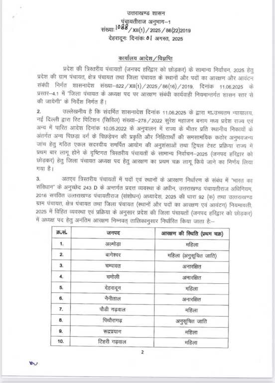 देहरादून। पंचायती राज विभाग ने पहली बार पंचायतों में ओबीसी आरक्षण के लिए गठित एकल सदस्यीय समर्पित आयोग की सिफारिशें लागू की हैं। इस हिसाब से ग्राम पंचायत के प्रधान से लेकर जिला पंचायत तक पदों का आरक्षण निर्धारित किया गया है। प्रदेश के 12 जिलों में त्रिस्तरीय पंचायत चुनाव के नतीजे आने के साथ ही जिला पंचायत अध्यक्ष पद के आरक्षण का अनंतिम प्रस्ताव जारी हो गया है। इस पर दो से चार अगस्त के बीच आपत्तियां दर्ज करा सकते हैं। छह को अंतिम आरक्षण जारी होगा।