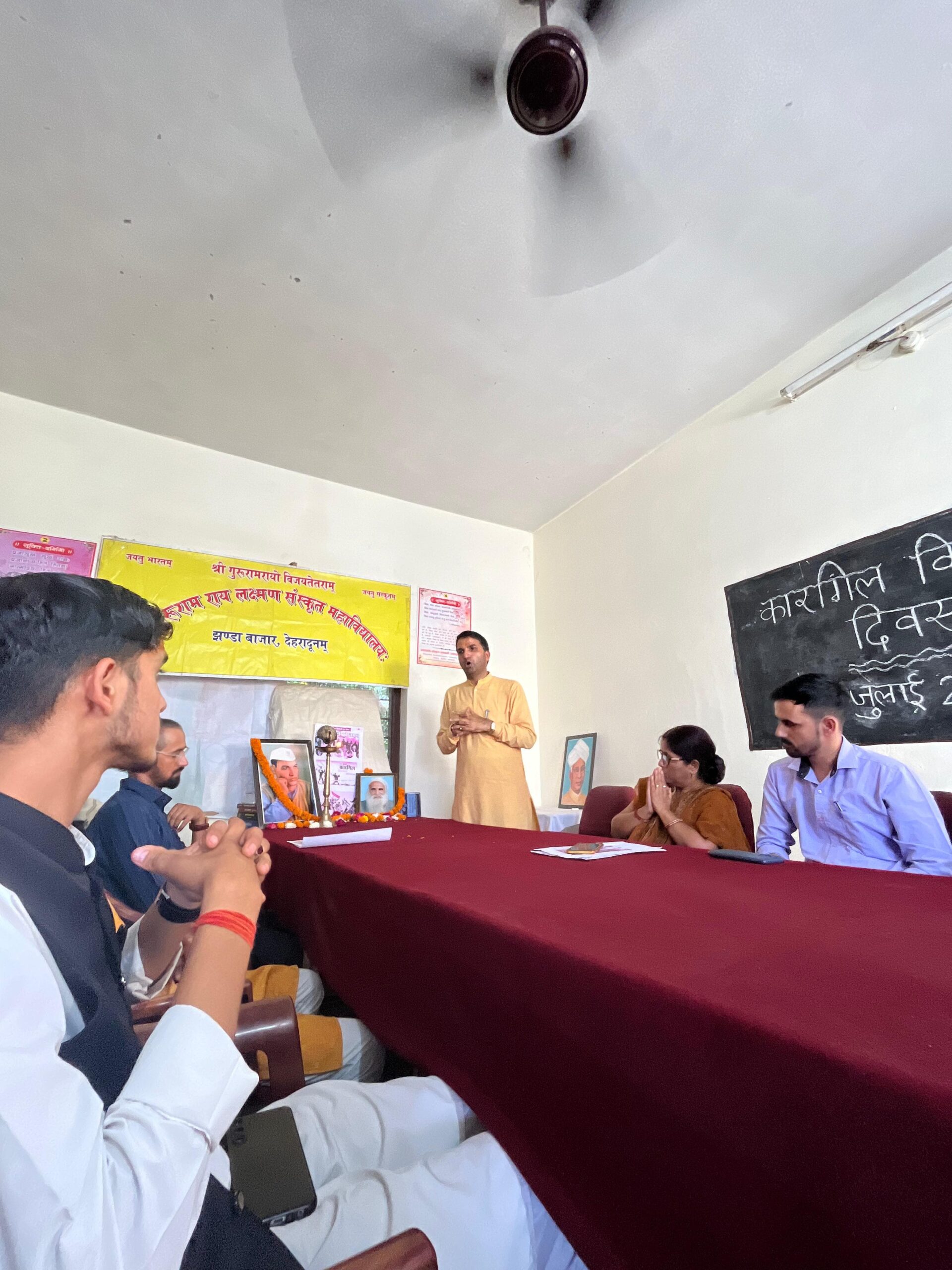 देहरादून: प्रतिवर्ष की भांति आम जनमानस में अमर शहीदों के बलिदान दिवस के अन्तर्गत देश भर समाचरित कारगिल विजय दिवस कार्यक्रमों की संपूर्ति के अवसर पर देहरादून महानगर में श्री गुरु राम राय लक्ष्मण संस्कृत महाविद्यालय की ओर से महाविद्यालय सभागार में अमर शहीदों को कारगिल विजय दिवस पर याद किया गया एवं शिक्षक तथा छात्रों ने श्रद्धांजलि अर्पित की । जिसमें महाविद्यालय के प्राचार्य डा० राम भूषण बिजल्वाण ने मुख्य वक्ता के रूप में अपने उद्बोधन में शहीदों को नमन किया तथा गत दिवस उत्तराखंड के क्रांतिकारी श्रीदेव सुमन की जन्म दिवस को याद किया वीर स्वतंत्रता सेनानी मंगल पांडे की क्रांति से लेकर आज तक चले आ रहे युद्धों पर भारतीय अमर शहीद सैनिकों का इतिहास स्मरण किया तथा संस्कृत छात्रों को देश प्रेम से जुड़ी तमाम गतिविधियों में हिस्से लेने हेतु प्रेरित किया। साथ ही डॉ राम भूषण बिजल्वाण ने कहा कि हमारी भारतीय ज्ञान परंपरा के मूल आधार ग्रन्थ संस्कृत वाङ्गमय में वीरता शौर्यता के साथ विश्व शांति के अनेकों उदाहरण हैं वैदिक सूत्रों में भी विश्व वन्धुत्व और राष्ट्र एकता राष्ट्र रक्षा के कई सूत्र मिलते हैं डॉ बिजल्वाण ने छात्रों को संबोधित करते हुए कहा कि वर्तमान समय भारतीय ज्ञान परंपरा का है और इसमें मुख्य भूमिका गुरुकुलीय शिक्षा ग्रहण करने वाले छात्र-छात्राओं की रहने वाली है इसलिए आप सभी छात्र इस चुनौती को अवसर में बदलें । हिंदी विभाग की अध्यक्षा डॉ. सीमा बिजल्वाण ने गोष्ठी में स्वागत भाषण से