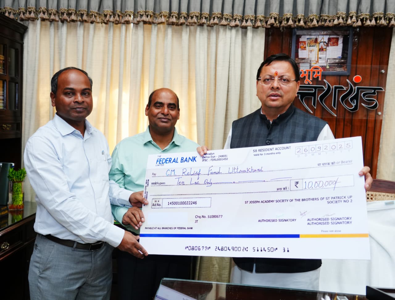 देहरादून। मुख्यमंत्री पुष्कर सिंह धामी से शनिवार को मुख्यमंत्री कैंप कार्यालय में सेंट जोसेफ अकादमी, देहरादून के स्कूल प्रबंधन ने मुलाकात कर आपदा पुनर्निर्माण के कार्यों के लिए मुख्यमंत्री राहत कोष में ₹10 लाख की धनराशि प्रदान की।