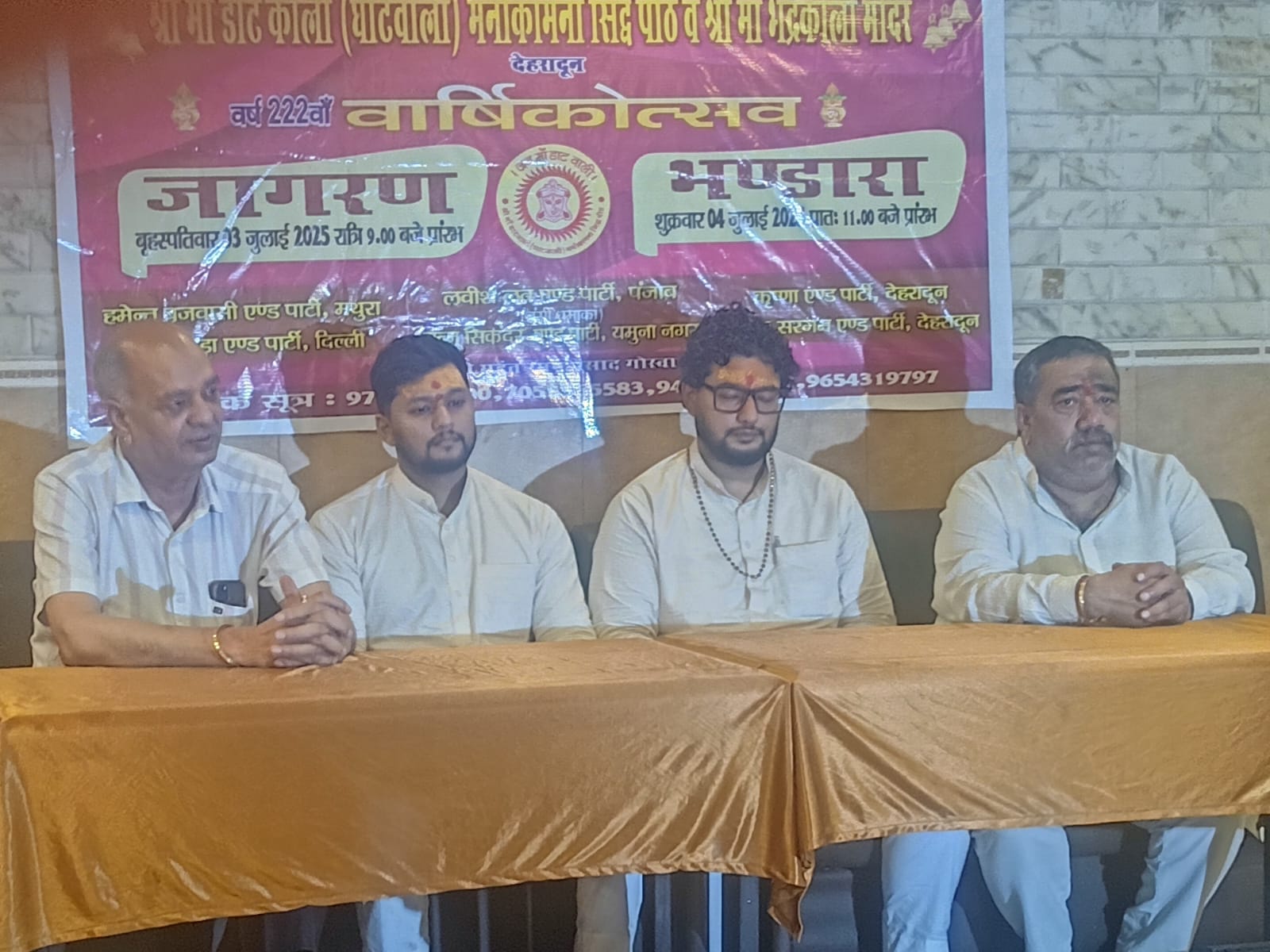 देहरादून, गढ़ संवेदना न्यूज। मां डाट काली मनोकामना सिद्ध पीठ का 222वां वार्षिकोत्सव भैरव पूजा के साथ प्रारंभ हुआ। सोमवार को सुबह छह बजे आचार्यों द्वारा शिव पूजा की गई। 1 जुलाई को सायं मंदिर परिसर में सुंदर कांड का पाठ प्रसिद्ध गायक हरिपाल आहूजा द्वारा किया जाएगा। 2 जुलाई को झंडा परिक्रमा सुभाषनगर से प्रारंभ होगी। 3 जुलाई को माता रानी का भव्य जागरण रात्रि 9 बजे प्रारंभ होगा। 4 जुलाई को मां का विशाल भंडारा पूर्वाह्न 11 बजे से प्रारंभ होगा। माता रानी के भजनों का गुणगान हेमंत बृजवासी, पप्पू अरोड़ा, मन्नु सिकन्दर, मनोज सरगम एंड पार्टी द्वारा किया जाएगा। इस वार्षिकोत्सव में देश-विदेश से मां के भक्त मंदिर आते हैं। इस बार फूलों की सजावट एवं बिजली की सजावट मुख्य आकर्षण है। यातायातकी समस्या को देखते हुए शोभायात्रा सुभाषनगर से मंदिर के लिए प्रस्थान करेगी ताकि आम जन मानस को असुविधा से बचाया जा सके। वार्षिकोत्सव कार्यक्रम की जानकारी देने के लिए दर्शनी गेट स्थित एक होटल में मंदिर के महंत रमन प्रसाद गोस्वामी के पुत्र शुभम गोस्वामी एवं संयम गोस्वामी के सानिध्य में पत्रकार वार्ता आयोजित की गई। पत्रकार वार्ता को दिनेश अग्रवाल एवं गौरव कुमार द्वारा संबोधित किया गया। इस मौके पर शिवम गोयल, विक्की प्रजापति वासू, परविन्दा आदि उपस्थित रहे।