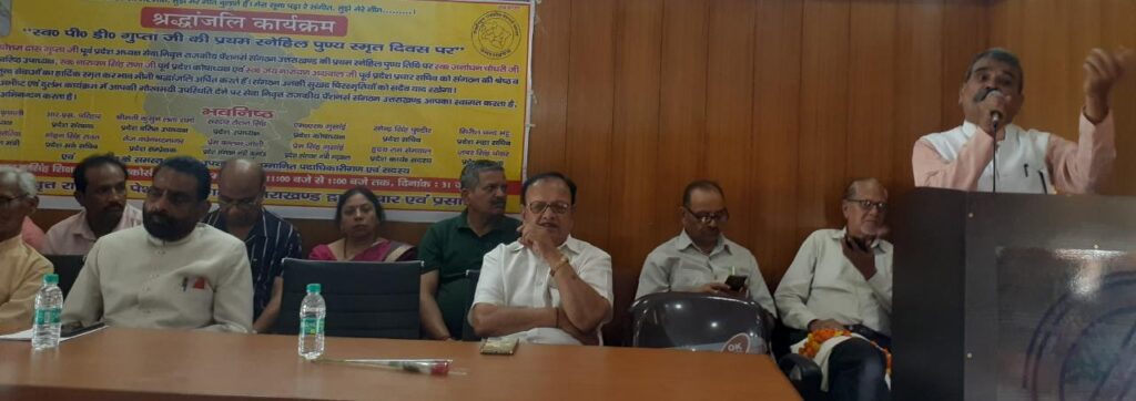 सुमेर चन्द रवि पूर्व लोक सेवा अयोग ने अपन सम्बोधन में कहा कि पूर्व पदाधिकारियों के परिवारों के संस्कार रहे हैं जो इन लम्बे समय तक संगठन की सेवा की। रवि ने कहा कि परिवार से मुख्यत अनुशासन व अच्छे संस्कार बनते हैं जो भविष्य के नागरिक बनते हैं। जो उत्कृष्ट राष्ट्र का निर्माण करते हैं, प्रदेश अध्यक्ष विरेन्द्र सिंह कृषाली ने अपने श्रद्धा सुमन अर्पित करते हुए कहा स्व० पी० डी0गुप्ता स्वयं में एक संगठन थे। उनका सादा जीवन हमेशा प्रेरणाप्रद रहेगा। पदाधिकारियों के परिवारों के प्रति संगठन कृतज्ञत प्रकट करता है तथा संगठन को हमेशा स्मरण रखने का अनुरोध किया है। कार्यक्रम की अध्यक्षता करते हुए संगठन के पूर्व संरक्षक एवं संस्थापक सदस्य यशवन्त सिंह पुण्डीर ने कहा कि गुप्ता के साथ लम्बे समय तक संगठन का कार्य किया और उत्तर प्रदेश उत्तराखण्ड बनने पर कर्मचारियों व पेंशनर्स की समस्याओं के समाधान के लिये कड़ा संघर्ष किया। वरिष्ठ उपाध्यक्ष कुसुम लता शर्मा ने स्व0 गुप्ता के साथ उत्तराखण्ड आन्दोलन के समय लम्बे समय तक संघर्ष किया तथा कर्मचारी-पेंशनर्स की समस्याओं का समाधान के लिये गुप्ता जी हर क्षण तैयार रहते थे। श्रद्धांजलि देते हुए नगर क्षेत्र देहरादून इकाई की कोषाध्यक्ष शोभा पाण्डेय ने मार्मिक कविता पाठ किया।संगठन के वर्तमान संरक्षक व संस्थापक सदस्य आर.एस.परिहार ने श्रद्धांजलि देते हुए कहा कि गुप्ता के साथ लगातार 18 वर्षों तक पेंशनर्स की समस्याओं के लिये संघर्ष किया उनका संघर्ष सदैव याद रखा जायेगा। इस कार्यक्रम में स्व0 गुप्ता की शिक्षिका सुपुत्री ने अपने पिता के त्याग, प्रेम व संघर्ष को याद किया जीवन पर्यन्त उनकी दी गयी शिक्षा को अमल करेंगे। श्रद्धांजलि कार्यक्रम में ब्रिगेडियर (से.नि .) के.जी.बहल, सुशील त्यागी, के.डी. शर्मा, ओमवीर चैधरी, विशम्बर नाथ बजाज,आर. एस. विरोरिया एवं ने सभी दिवंगत पदाधिकारियों के संघर्ष को याद कर श्रद्धा सुमन अर्पित किये। श्रद्धांजलि कार्यक्रम में पहले आर.एस.परिहार, मीनू गुप्ता, दिनेश गुप्ता,नवनीत चैधरी,विरेन्द्र सिंह कृषाली,जबर सिंह पंवार,एम. एस.गुसाइँ, गुलशन कुमार,मोहन सिंह रावत आदि ने दीप प्रज्जवलित कर चित्रों पर माल्यार्पण कर श्रद्धासुमन अर्पित किये।